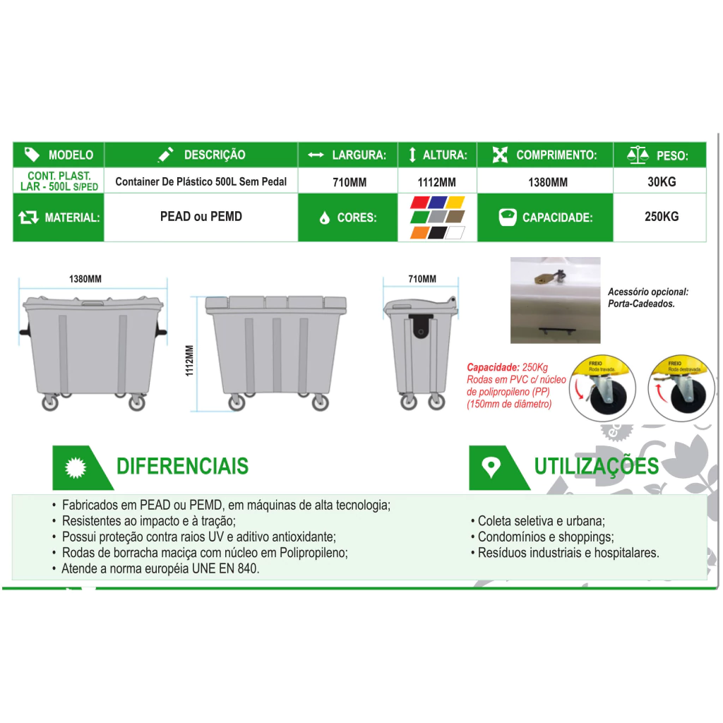 Contêiner Contentor de Lixo 500 Litros sem Pedal